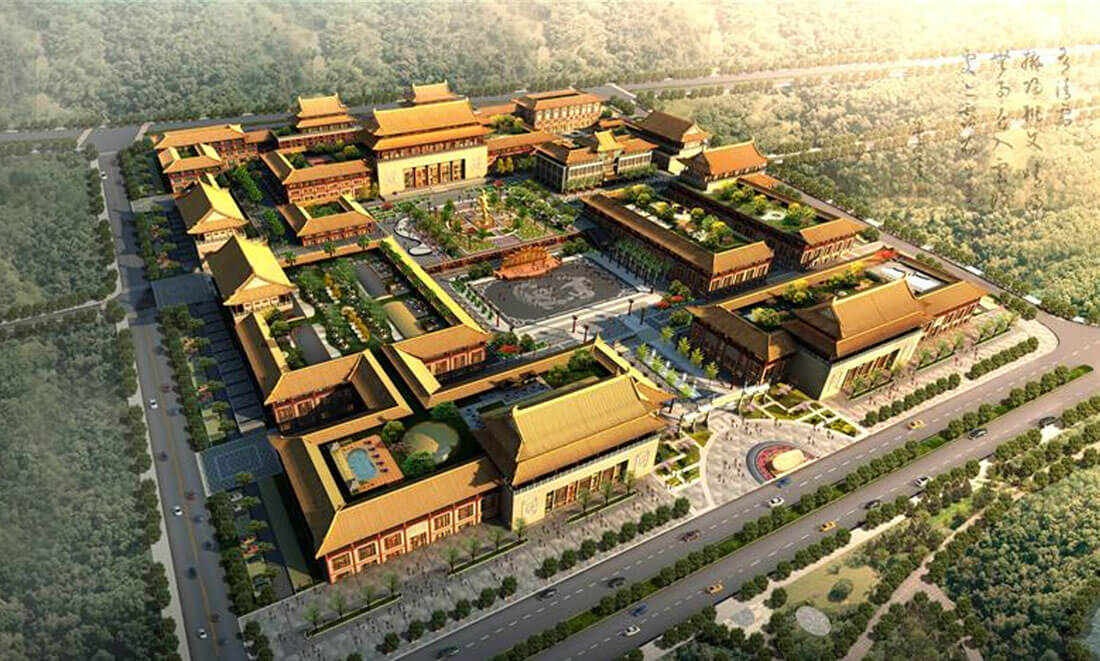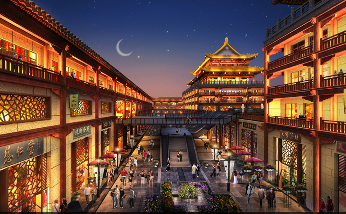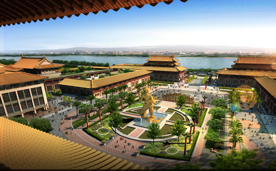 览中国古典工艺博览城建筑设计上继承盛唐大 明宫风格,总平面以九宫格的“九经九纬”格 局布置,气魄宏大,格局开阔,开合有序,虚实有致。 同时又融合了宋代以及明清风格,使之成为古典建筑 的集大成之作。屋檐装饰采用歇山顶,简化梁、柱、 回廊,突出斗拱,窗格以冰裂格、什锦窗为主。